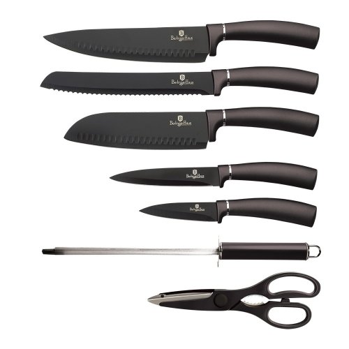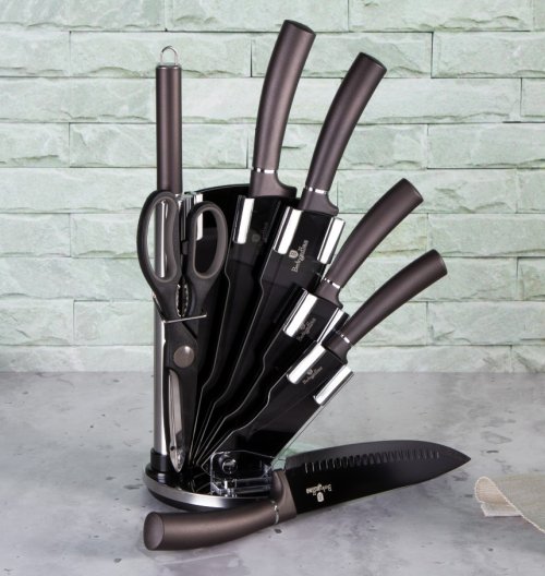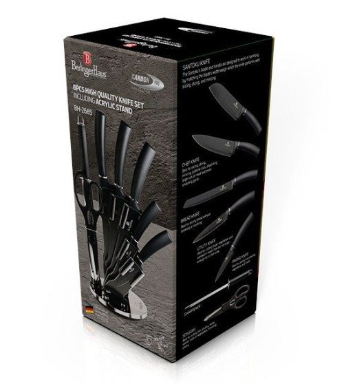 Sada nožů ve stojanu s nepřilnavým povrchem 8 ks Carbon PRO Line je výbornou alternativou pro kuchaře různých úrovní, na jejíž výrobu byl použit kvalitní materiál: nerez ocel s nepřilnavým povrchem, vynikají perfektní ostrostí čepele a designem. Velmi oceníte i ergonomicky tvarovanou rukojeť, díky které se vám nože budou skvěle držet. Celá sada je dílem výrobce BERLINGERHAUS, jež se výrobě nožů věnuje poměrně dlouho a jsou řádně odzkoušeny.