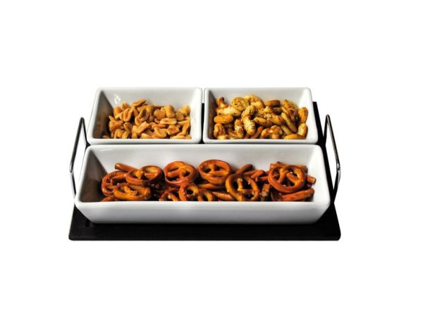 Velmi oblíbená sada tří misek na dřevěném podnose je velmi praktická při servírování různých pokrmů, nerezová ouška po stranách podnosu zajišťují lehkou manipulaci.
