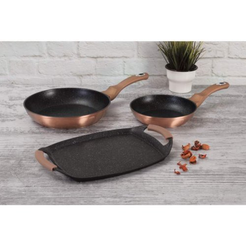 Luxusní sada pánví Metallic Line Rose Gold Edition nabízí skvělý výkon a elegantní design. Vyrobené z kovaného hliníku s mramorovým povrchem, tyto pánve zajistí rovnoměrné rozložení tepla a usnadní vaření. Sada obsahuje dvě pánve a grilovací desku, které pokryjí širokou škálu vaření, od restování zeleniny po grilování masa. S růžovo-zlatým designem a silikonovými rukojeťmi jsou nejen funkční, ale i stylovým doplňkem do každé moderní kuchyně.