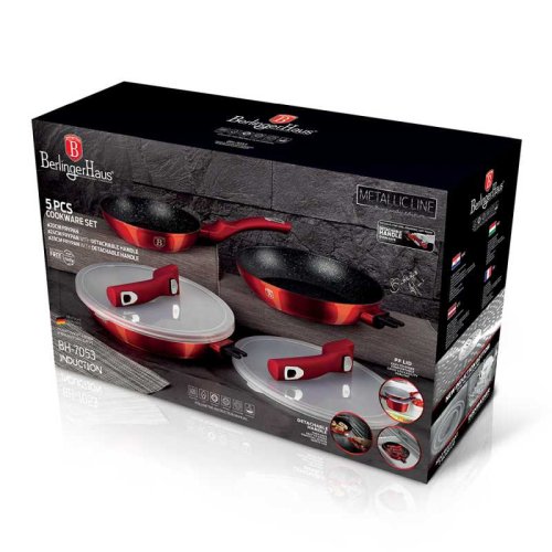 Multifunkční sada pánví Burgundy Metallic obsahuje celkem 3 pánve a 2 kulatá skladovací víčka. Velká a střední pánvička mají navíc odnímatelnou rukojeť, takže je můžete bez obav vložit do trouby pro zapékání až do 220°C. Zároveň to šetří místo při skladování.