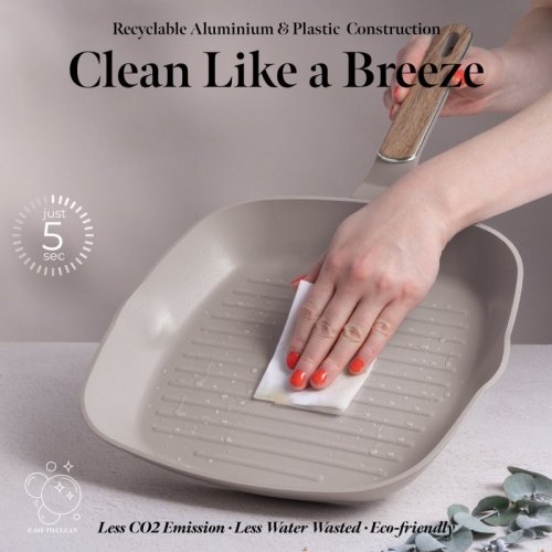 Elegantní a praktická sada pánví v matném šedohnědém odstínu s dřevěnými detaily, která přináší do vaší kuchyně příjemný severský styl a maximální komfort při vaření.