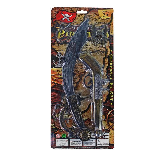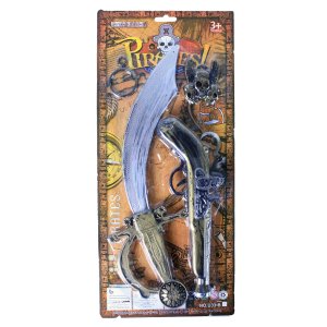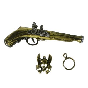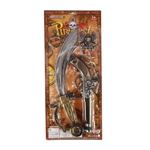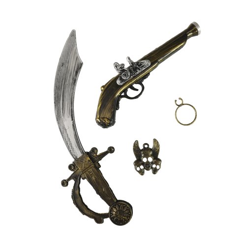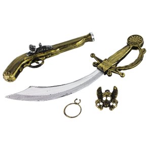 Pirátská sada pro všechny malé piráty! Set obsahuje stříbrný meč s bronzovou rukojetí, bronzovou pistoli, náušnici a pirátský přívěšek. Perfektní doplňky ke kostýmu piráta nebo jen tak na hraní!