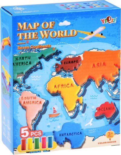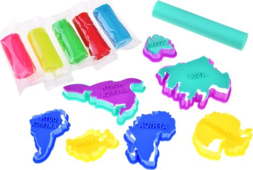 Sada obsahuje: modelovací hmotu v pěti barvách (každá cca 25 g), 7 formiček s tvary kontinentů, 7 razítek s názvy kontinentů, váleček.
