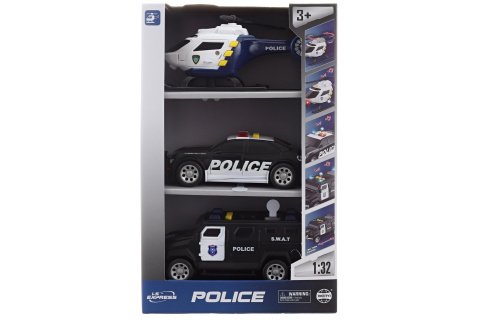 Krásná sada 3 policejních dopravních prostředků - 2x auto + 1x helikoptéra. Každý dopravní prostředek je napájen na 3xAG13 baterie - baterie jsou součástí balení. Zvuky troubení, houkání a startování. Rozměry balení 19x30x9 cm. Velikost auta cca 15 cm. Materiál plast. Baleno v otevřené krabici. Věk 3+