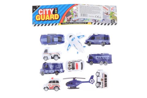Sada policejních aut obsahuje 7 policejních plastových aut,1x sanita, 1x letadlo a 1x helikoptera.Velikost prostředků cca 6 cm.Rozměr balení 20,5 x 23,5 cm.Věk 3+