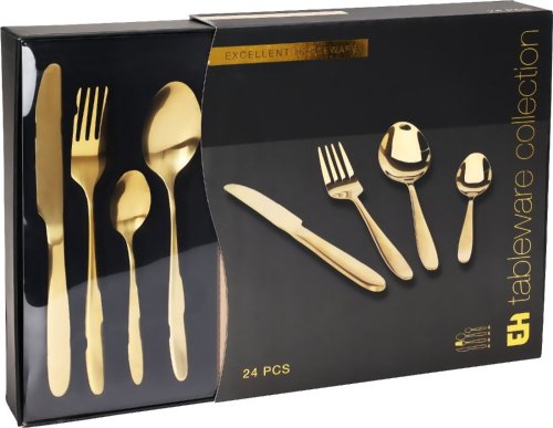 Luxusní sada příborů z nerezové oceli se zlatým PVD povlakem a zrcadlově leštěným povrchem. Ideální pro elegantní stolování a speciální příležitosti.