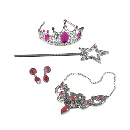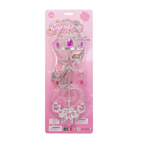 Proměňte se v okouzlující princeznu! Tato nádherná dětská sada obsahuje vše, co malá královská duše potřebuje ke své proměně – stříbrnou korunku, kouzelnou hůlku, elegantní náhrdelník a třpytivé náušnice. Některé kousky jsou zdobeny zářivými růžovými kamínky, které dodávají celé sadě pohádkový vzhled. Ideální na karneval, narozeninovou oslavu, hraní na princeznu nebo jen tak pro radost.