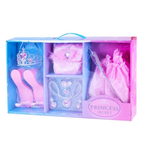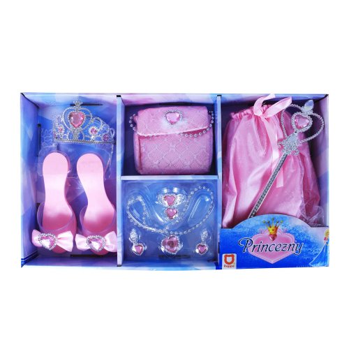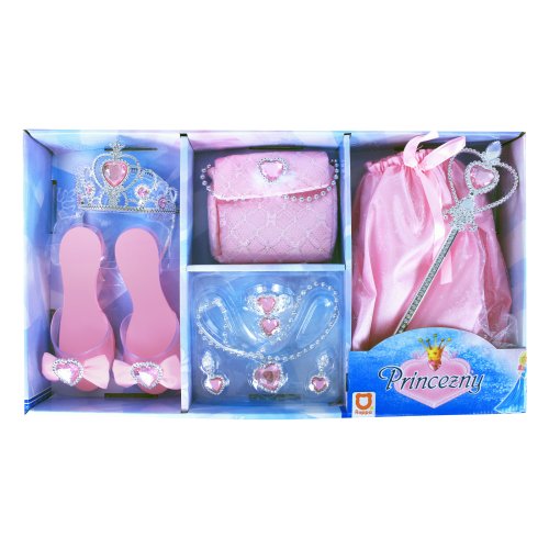 Exkluzivní sada pro princezny! Tato stylová souprava obsahuje sukničku, střevíčky, korunku, žezlo, náušnice, prsten, náhrdelník a kabelku. Vše je krásně sladěno a zdobeno krásnými ozdobnými kamínky růžové barvy. Obohať svůj kostým princezny o tyto nádherné doplňky!
