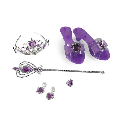 Proměň se v opravdovou princeznu! Tato krásná sada obsahuje vše, co malá parádnice potřebuje ke svým pohádkovým dobrodružstvím. Elegantní střevíčky, korunku, náušnice, prstýnek a kouzelnou hůlku. Díky stříbrno-fialové barevné kombinaci působí celý set velmi slavnostně a okouzlujícím dojmem. Hodí se nejen na hraní doma, ale i na karnevaly, narozeninové oslavy či dětské párty.