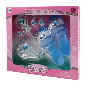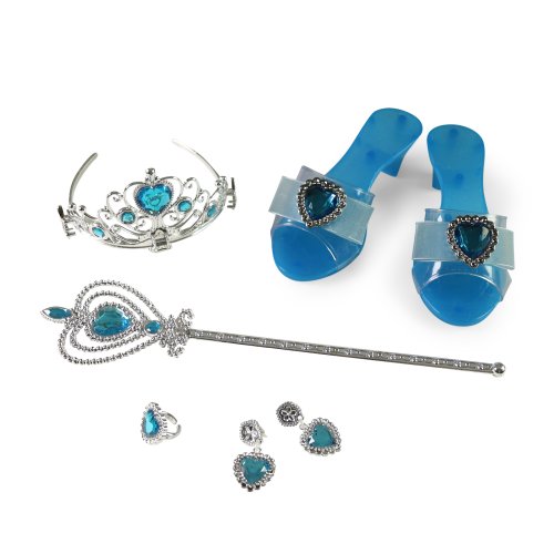 Proměň se v opravdovou princeznu! Tato krásná sada obsahuje vše, co malá parádnice potřebuje ke svým pohádkovým dobrodružstvím. Elegantní střevíčky, korunku, náušnice, prstýnek a kouzelnou hůlku. Díky stříbrno-modré barevné kombinaci působí celý set velmi slavnostně a okouzlujícím dojmem. Hodí se nejen na hraní doma, ale i na karnevaly, narozeninové oslavy či dětské párty.