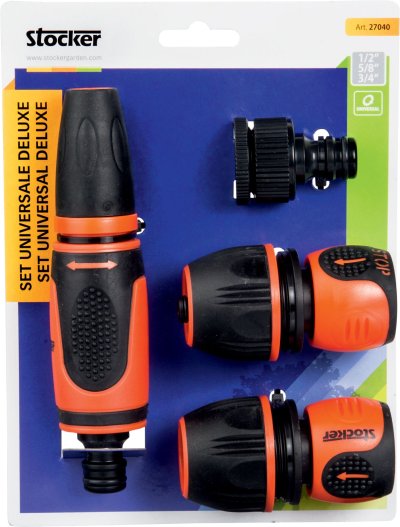 Sada DeLuxe obsahuje dvě rychlospojky, postřikovací trysku a šroubení.