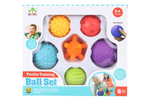 Sada gumových senzorických míčků. V balení je 6 kusů různých barev a tvarů. Rozměr jednoho míčku cca 6,5 x 6,5 cm (dle druhu). Rozměry balení cca 30 x 26 x 8,5 cm. Věk 0m+