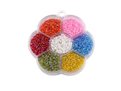 Plastový box ve tvaru květu obsahuje barevný mix skleněného rokajlu a tyček. Sadu využijete na tvorbu bižuterie a vánočních ozdob. Rokajl má různé složení velikostí, orientačně se jedná o velikost 2,1 - 2,7 mm, průvlek 0,5 mm. Tyčky jsou dlouhé od 3 do 10 mm. Upozorňujeme zákazníky, že v některých boxech je pouze rokajl, v některých naopak jen tyčky. Doporučujeme detailně si prohlédnout fotografii. [Víčko je sundavací, box má očko k zavěšení. Hmotnost rokajlu celkem je cca 30 g, v každé přihrádce je cca 4,3 g rokajlu.]
