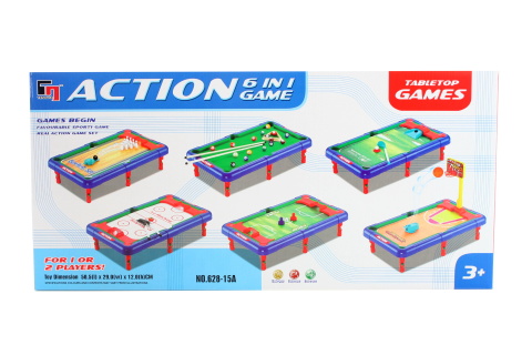 Velká sada sportovních her v jednom balení. Na jednom stolku lze hrát až 6 her (bowling, basketbal, lední hokej, kulečník, golf a fotbal). Rozměr hracího stolu 50 x 29 x 12 cm. Rozměry balení cca 62 x 30 x 5 cm. Věk 3+