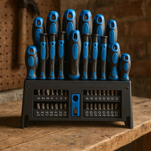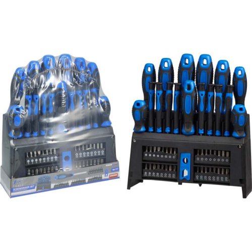Kompletní sada šroubováků v modro-černém provedení, baleno v kartonovém zásobníku s PP smrštovacím a papírovým obalem.