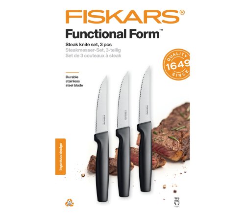 Steakový nůž má vroubkované 12 cm dlouhé ostří. Využijete ho jako jídelní nůž na steaky, ale můžete s ním také krájet potraviny s kůrkou, jako například čerstvé pečivo či menší chléb. Výborně se s ním krájí i potraviny s tenkou slupkou, obzvláště rajčata nebo broskve. Sada obsahuje tři steakové nože. Hmotnost: 0,183 kg. Původní FIS číslo 1014280.