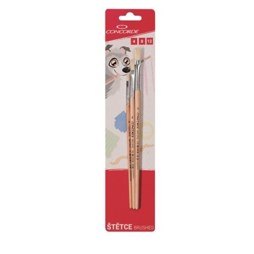 Sada štětců CONCORDE Natural z prasečích štětin Balení obsahuje tři ploché štětce ve velikosti 4, 8, 12 Dřevěná natural rukojeť Dodáváno na blistru