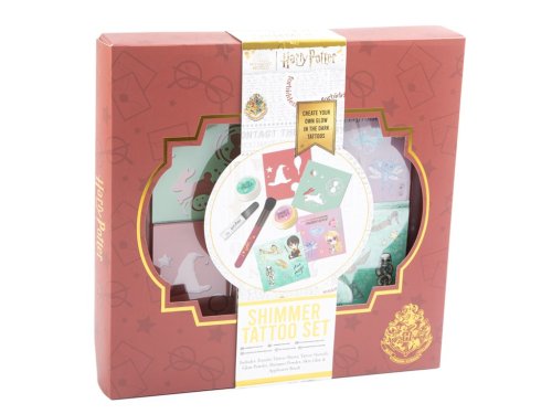 Sada třpytivého tetování Harry Potter – vytvořte si svoje tetování svítící ve tmě. Sada obsahuje – šablony na tetování, svítící prášek, třpytivý prášek, kartičky s tetovačkami, tělové lepidlo a štětec.
