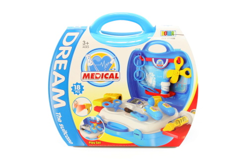 Doktorská sada obsahuje: kufřík o velikosti cca 22x17cm, 1x brýle, 1x pilulky, 2x nůžky, 7x lékařské nástroje. Věk 3+