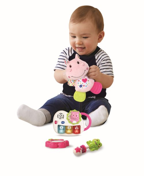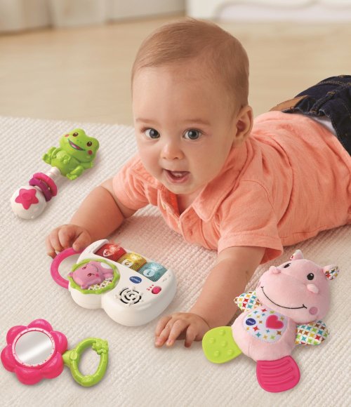 První dárek pro miminko od VTech® je jedinečný soubor hraček pro právě narozené miminko, které mu v prvních měsících jeho života budou přinášet spoustu radosti i poznání. Součástí je: Hrající a zpívající piáno, hebký hrošík, zrcátko, chrastítko žabička 1. Hrající a zpívající piáno. Mluví a zpívá česky. Stisknutím svítících kláves se dítě dozví něco o zvířatech, číslech, barvách, tvarech, uslyší zábavné písničky a melodie. Blikající klávesy stimulují zrakové vnímání. Rukověť piánka je přizpůsobena malým dětským ručičkám podporuje tak i rozvoj jemné motoriky dítěte. 2. Hebký hrošík. Sametově hebký hrošík s nožičkami pro žužlání a kousání. Svým tvarováním a texturami rozvíjí hmatovou stimulaci dítěte. Nohy hrošíka určené ke kousání, masírují i chladí dásně dítěte, a pomáhají nejen ke zklidnění dítěte, ale i od bolestí, které mohou první zoubky způsobovat. 3. Zrcátko. Se snadno uchopitelným držátkem rozvíjí sebepoznávání dítěte. 4. Chrastítko žabička. Třepáním chrastítkem rozvíjí dítě motorické dovednosti i zvukové vnímání.