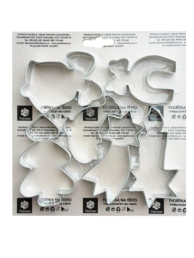Sada obsahuje zvonek s mašlí, svíčku, stromek, podkovu s mašlí, delfína a kometu. Velikost 70 až 80 mm. Materiál pocínovaný zdravotně nezávadný plech. Český výrobce. Není vhodné do myčky nádobí. EAN 8594034705557