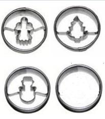 Sada vykrajovátek 4 ks - tvar kolečko s vánočním motivem. Vhodné na cukroví, perníčky, potahové nebo modelovací hmoty. Vykrajovátka jsou od českého výrobce a splňují všechny předepsané normy, vyrobeno z pocínovaného plechu. Průměr - 4 cm.