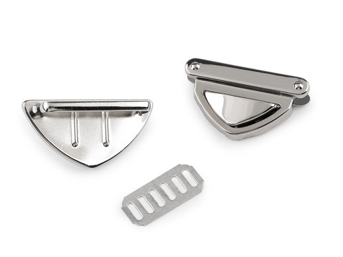 Klasické zapínání využijete na tašku, kabelku i batoh. Vyniká kvalitním zpracováním. Sada se skládá ze tří dílů. Plíšek se připevní na vnitřní část tašky, díl s nožkami na vnější část (nožky se zaháknou do plíšku a roztáhnou) a třetí díl se zoubky na její chlopeň. Díl na chlopeň se upevní tak, že rozevřete čelisti se zoubky a mezi ně vložíte materiál, na který chcete zapínání upevnit. Následně čelisti sevřete - zoubky zamezí pohybu látky. Rozměry: - plíšek: 12 x 26 mm - díl s nožkami: 22 x 42 mm - díl na chlopeň: 23 x 40 mm Celkové rozměry po zapnutí jsou 42 x 27 mm.