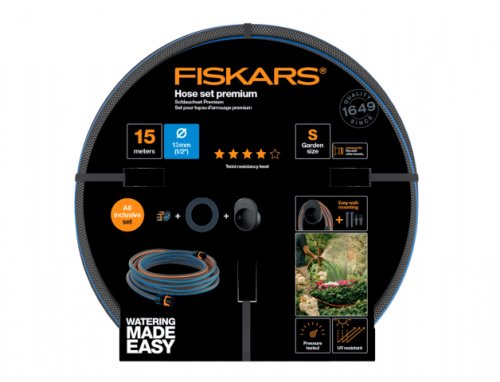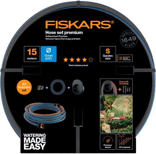 Vysoce kvalitní, snadno ovladatelná 1/2 coulová hadice pro malé zahradní zavlažování. Délka hadice 15 m zakončené rychlospojkami. Odolný nástěnný držák. Upevňovací prvky pro montáž na stěnu jsou součástí balení. Odolnost proti zkroucení úroveň 4. Ochrana proti UV záření. Neobsahuje ftaláty. Barevné označení pro snadný výběr vhodné hadice a konektoru. Výška: 39,5 cm, délka: 39 cm, šířka: 6,5 cm. Hmotnost: 2,05 kg.