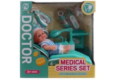 Zubařská sada s panenkou. Sada obsahuje panenku o velikosti cca 20 cm, zubařské křeslo a doplňky. Napájení na 2xAG13 baterie. Baleno v krabici. Rozměry balení 30x31x16 cm. Materiál plast. Věk 3+