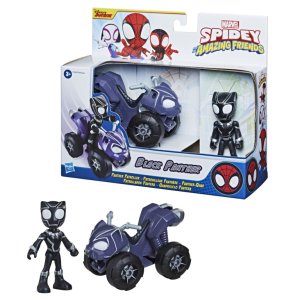 Dobrodružství Spider-Mana nikdy neberou konce! Přichází nová sada s parádní figurkou a vozidlem, která je inspirována seriálem Spider-Man a jeho úžasní přátelé na Disney Junior! Všechny postavy, které jsou inspirovány animovaným seriálem na Disney Junior, můžete posadit do přiloženého vozidla, a hrát si, ať už jste kdekoliv. V sadě najdete figurky Spider Gwen s pavoučím motocyklem, Spider-Man se závodním autem, Black Panther s terénním motocyklem a Miles Morales s terénní tříkolkou. Zahrnuje figurku a vozidlo.