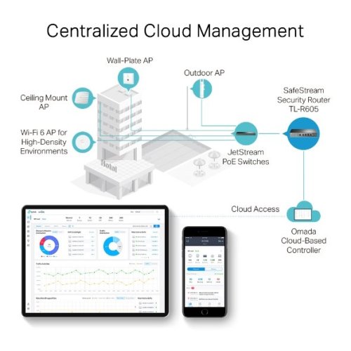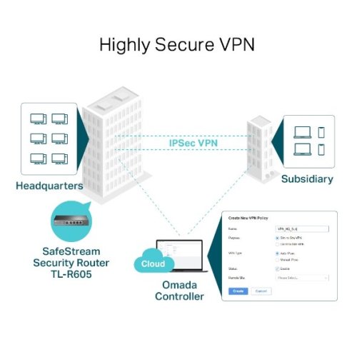 ER605 - Omada Gigabit VPN Router FUNKCE - Centralizovaná správa: Cloudový přístup a aplikace Omada pro mimořádné pohodlí a snadnou správu - Pět gigabitových portů: Vysokorychlostní kabelové připojení - Až 3 porty WAN: 1 gigabitový port WAN a 2 gigabitové porty WAN/LAN s vyvážením zátěže zvyšují míru využití víceřádkového širokopásmového připojení - Vysoce zabezpečená VPN: Podporuje až 20x IPsec LAN-to-LAN, 16x OpenVPN, 16x L2TP a 16x PPTP připojení VPN - Bohaté bezpečnostní funkce: Pokročilé zásady brány firewall, ochrana DoS, filtrování IP/MAC/URL a další funkce zabezpečení chrání vaši síť a data - Jeden port USB WAN pro mobilní širokopásmové připojení TECHNICKÉ VLASTNOSTI Rozhraní: 1x Gigabit WAN port, 2x Gigabit LAN/WAN porty, 2x Gigabit LAN port Tlačítko: Reset Napájecí zdroj: externí 9V/0.85 A DC Flash: 16 MB SPI DRAM: 128 MB LED: PWR, SYS, WAN (Link/Act), LAN Rozměry (Š x H x V): 158 × 101 × 25 mm Certifikace: CE, FCC, RoHS OBSAH BALENÍ - ER605- Napájecí adaptér- RJ-45 Ethernetový kabel- Uživatelská instalační příručka