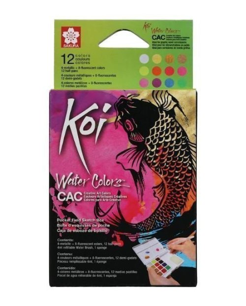 Koi Water Colors 12 Creative Art Colors (CAC) je sada akvarelových barev plná jedinečných barev a povrchových úprav pro jedinečné projekty. Tato kompaktní sada obsahuje 4 metalické a 8 fluorescenčních barev a obsahuje míchací paletu ve víčku krabičky, houbičku a Koi Water Brush (štětec s nádržkou na vodu).Vytvořte si vlastní jedinečné barvy smícháním metalických a fluorescenčních barev nebo prozkoumejte zcela nové spektrum úžasných efektů smícháním těchto kreativních uměleckých barev s tradičními akvarelovými barvami. Bohatý barevný sortiment Koi nabízí možnost volby při vytváření odvážných odstínů nebo jemných a decentních odstínů s přidáním metalických a fluorescenčních akvarelových barev. Mějte tuto malou sadu po ruce ve svém ateliéru pro rychlé stříkání barev a vytváření hlubokých stínů pro pozadí. Nebo si ji vezměte s sebou na tvorbu portrétů a plenérových krajin v přírodě. Tato krabička kapesní velikosti se také skvěle hodí k přidávání barev do komiksů, ilustrací a projektů s písmem.