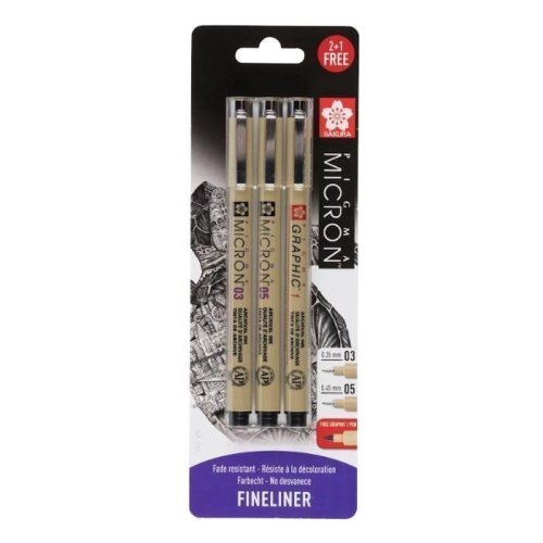 Tento blistr obsahuje 1 Pigma Micron 03, 1 Pigma Micron 05 a 1 grafické pero zdarma.