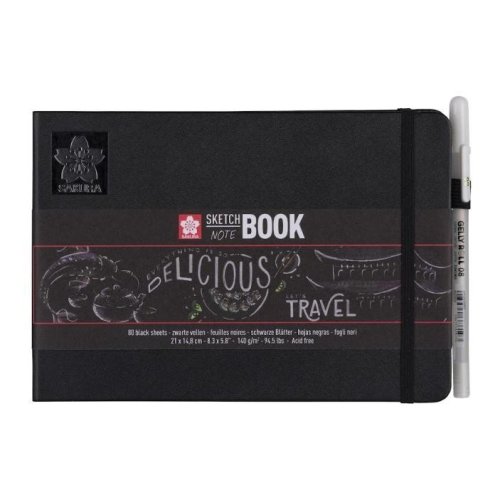 Skicák/zápisník Sakura o rozměrech 21 x 14,8 cm (A5) s 80 černými listy bezkyselinového papíru 140 g/m2 uchovává všechny vaše výtvory vytvořené tuší, tužkou, olejovým pastelem nebo uhlím na jednom místě. Exkluzivně ilustrované pouzdro lze použít jako popisovač. Umělecké dílo: Anne Jorinde (Gouden Lijntjes). Kniha s pevnými deskami je dodávána s pouzdrem na pera, které se dokonale hodí pro pera, jako je Pigma Micron a Sakura Gelly Roll. V zadní části Sketch - notebooku je přiložena rozšiřitelná obálka pro ukládání skic a poznámek. Pružný uzavírací pásek zajišťuje, že kniha zůstane při cestování zavřená a kompaktní. Zápisníky Sakura Sketch - jsou ideální pro skicování a psaní s výrobky Sakura: Pigma Micron, Pigma Brush, Koi Coloring Brush Pen, Gelly Roll, Permapaque a originální Cray-Pas. Zápisníky Sakura Sketch - jsou k dispozici s krémově bílými nebo černými stránkami, v různých velikostech.