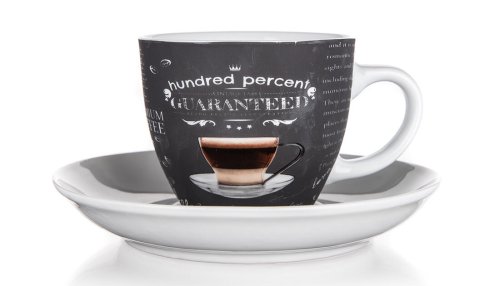 Šálek s podšálkem s dekorem 100 PERCENT, je vhodný na podávání kávy. Šálek s podšálkem lze použít do mikrovlnné trouby a mýt v myčce na nádobí, na šetrný program. UPOZORNĚNÍ: Použití myčky na šetrný program.