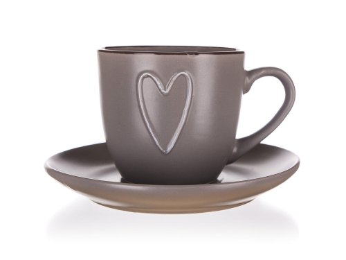 Šálek HEART s podšálkem, s dekorem srdce, je vyrobený z kvalitní keramiky. Lze použít do mikrovlnné trouby i do myčky na běžné domácí použití.