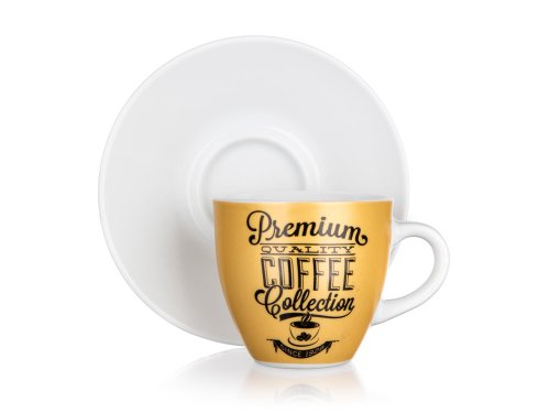 Šálek s podšálkem s dekorem PREMIUM COFFEE, je vhodný na podávání kávy. Šálek s podšálkem lze použít do mikrovlnné trouby a mýt v myčce na nádobí, na šetrný program.