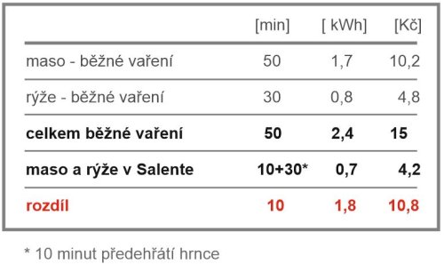 vaření hovězích plátků na houbách s natural červenou rýží vařených běžným způsobem na dvou plotýnkách elektrického vařiče s příkonem 1600 a 2000 W. Dále je v tabulce uveden příklad vaření téhož jídla v hrnci Salente, který ušetří při jednom vaření částku 10,8 Kč a zkrátí čas vaření o 10 minut. Další peníze ušetří hrnec Salente při fritování. Multifunkční hrnec je tepelně izolován a vyhřívá menší objem, než klasická trouba