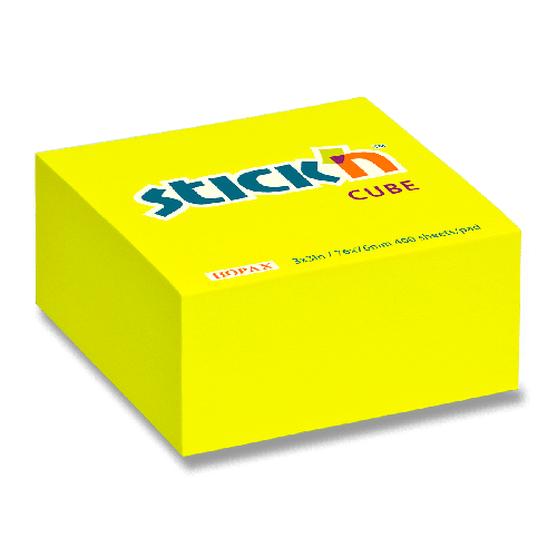 Samolepicí bloček ve tvaru kostky. Velikost 76 x 76 mm, 400 listů, neonová, žlutá.