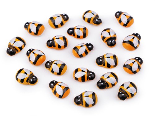 Dřevěné včely mají na spodní straně samolepicí pěnovou tečku. Využijete je k ozdobení alb, pozvánek, krabiček, věnců, květináčů i samotných květin, kam je můžete nalepit třeba na listy.