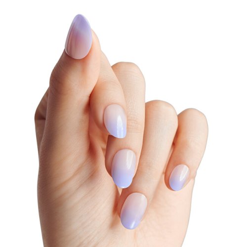 Světle modré ombré nehty v krátkém oválném tvaru, kombinují moderní styl a maximální pohodlí díky technologii PureFit, která zajišťuje ultra tenké a přirozeně vypadající nehty. Díky technologii Color Reimagined vytvářejí intenzivní barvy inspirované salonními technikami, které běžný lak nikdy nedokáže napodobit. No Glue technologie zajišťuje aplikaci bez potřeby lepidla.