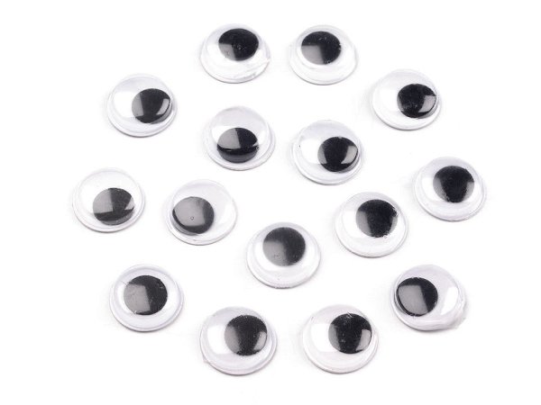Plastové oči dodají obličejům lidí nebo zvířat ten správný výraz. Záleží jen na vaší fantazii, kam je nalepíte. Černá čočka je pohyblivá. Spodní strana je opatřená samolepicí fólií. Nalepení očí je snadné. Odlepte spodní krycí papír a oči přilepte na suchý, čistý, pevný povrch. Široké uplatnění najdou při tvorbě originálních přání technikou scrapbooking.