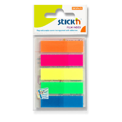 Samolepicí zářivě neonové proužky. Vhodné ke korekturám textu a jako záložky. Průhledná neonová fólie, která nepřekrývá text dokumentu. Rozměr 45 x 12 mm, 5 barev x 25 listů