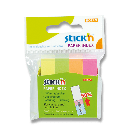Samolepicí papírové záložky v neonových barvách. Malé, rozměr 50 x 12 mm, 4 x 100 listů.