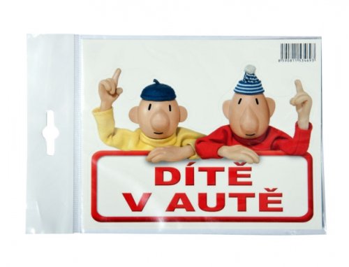 Samolepka na auto s populární dvojicí Pat a Mat. Nálepka má nápis: Dítě v autě. Rozměr: 15 x 12 cm.