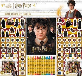 Set obsahuje téměř 500 různých druhů samolepek, blok (32 listů) ke psaní i malování a 12 voskovek. Tento velký samolepkový set obsahuje více než 500 samolepek s motivy oblíbených postav a scén z kouzelnického světa. Součástí balení je také blok s obálkou Harry Potter a sada 12 voskovek, se kterými si děti mohou vytvářet vlastní magické obrázky. Vhodné pro děti od 3 let.