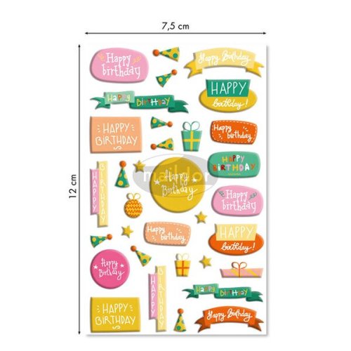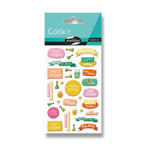 Samolepky Maildor 3D Cooky s motivy narozeninové oslavy a s efektem 3D. Balení obsahuje 1 arch s 27 samolepkami.