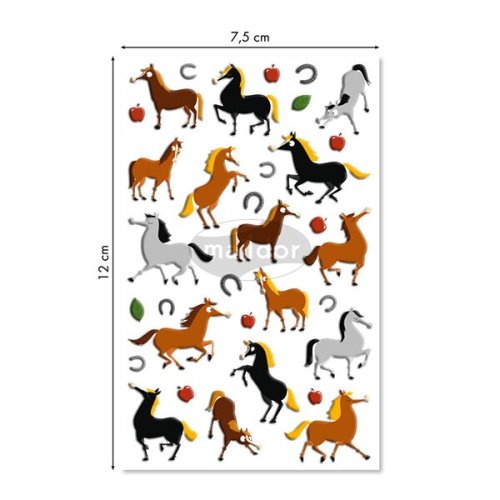 Samolepky Maildor 3D Cooky s motivy koní a s efektem 3D. Balení obsahuje 1 arch s 33 samolepkami. Rozměr balení 7,5 x 12 cm.