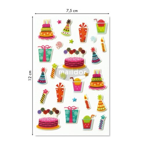 Samolepky Maildor 3D Cooky s narozeninovými motivy a s efektem 3D. Balení obsahuje 1 arch s 27 samolepkami. Rozměr balení 7,5 x 12 cm.