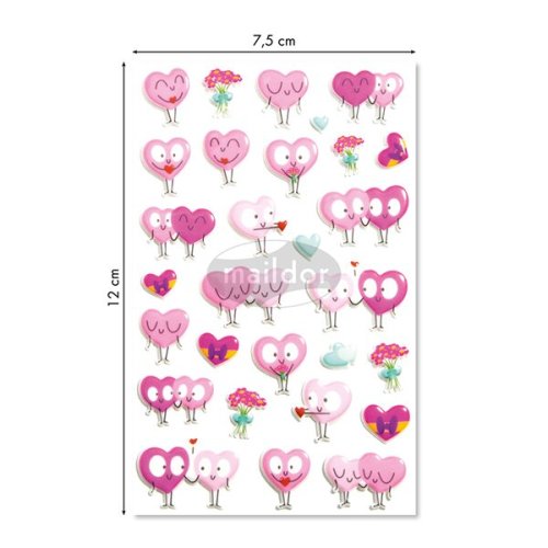 Samolepky Maildor 3D Cooky s motivy zamilovaných srdíček a s efektem 3D. Balení obsahuje 1 arch s 29 samolepkami.